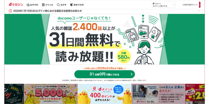 dマガジンは、NTTドコモが運営する雑誌読み放題サービスです。ドコモユーザー以外でもdアカウントを作成すれば利用できます。