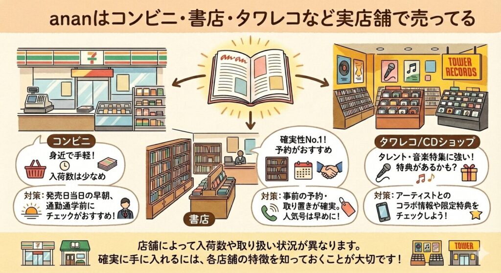 この記事では、ananが買える実店舗(コンビニ・書店・タワレコなど)から、売り切れでも確実に手に入る通販サイト、さらに電子版で今すぐ読める方法まで徹底解説します。