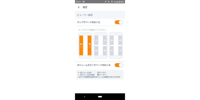 ページをめくる設定で、タップやボリュームボタンでの操作ができるようになり自分の読みやすい方法にカスタマイズができます。