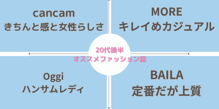 • 20代後半向け: CanCam、Oggi、BAILA、MOREがおすすめ